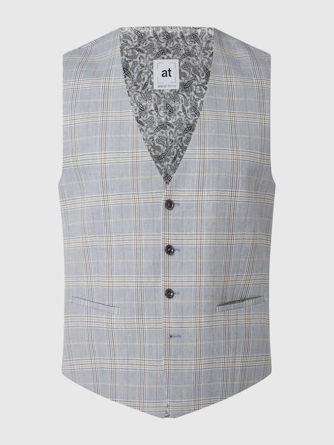Die Weste von atelier torino ist aus einer Materialmischung mit Leinen-, Viskose- und Stretch-Anteil gefertigt. Sie kommt in schmaler Passform mit Vichy-Karo, Leistentaschen und verstellbarem Riegel am Rücken.