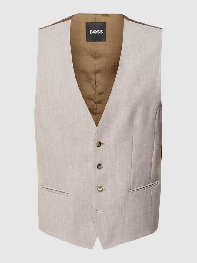 Die Weste von BOSS ist aus einem Schurwoll-Mix mit Viskose-Anteil gefertigt und im Regular Fit gehalten. Sie kommt mit Eingrifftaschen, durchgehender Knopfleiste und Allover-Label.