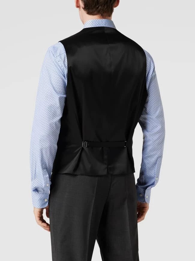 Die Weste von BOSS ist aus einem Schurwoll-Mix mit Stretch-Anteil gefertigt und im Regular Fit gehalten. Sie zeigt sich in unifarbenem Design mit V-Ausschnitt, Ziernähten, Knopfleiste, Paspeltaschen und verstellbarem Riegel auf der Rückseite.