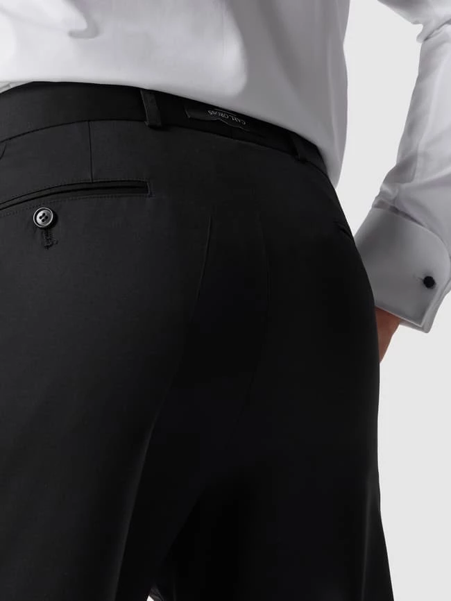 Die Anzughose von Carl Gross ist aus reiner Schurwolle gefertigt. Sie zeigt sich im Modern Fit mit französischen Eingrifftaschen und geknöpften Paspeltaschen am Gesäß.