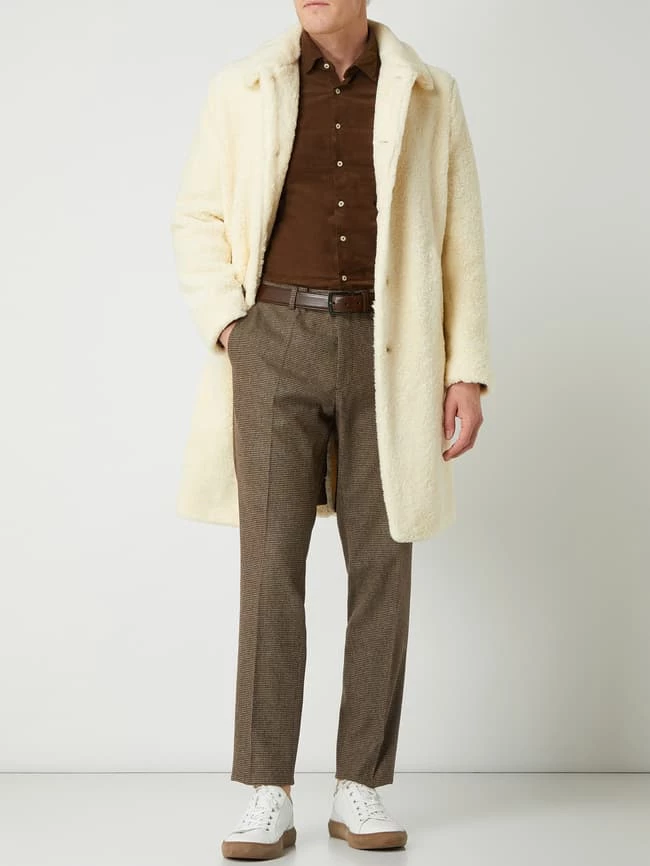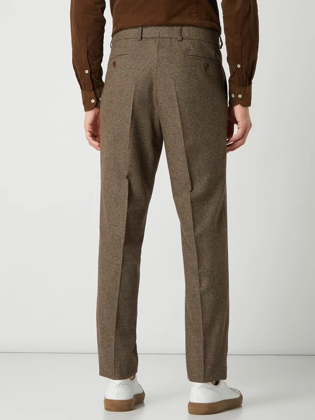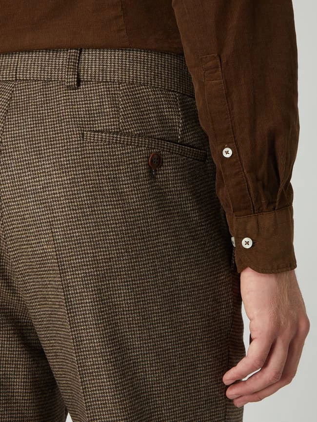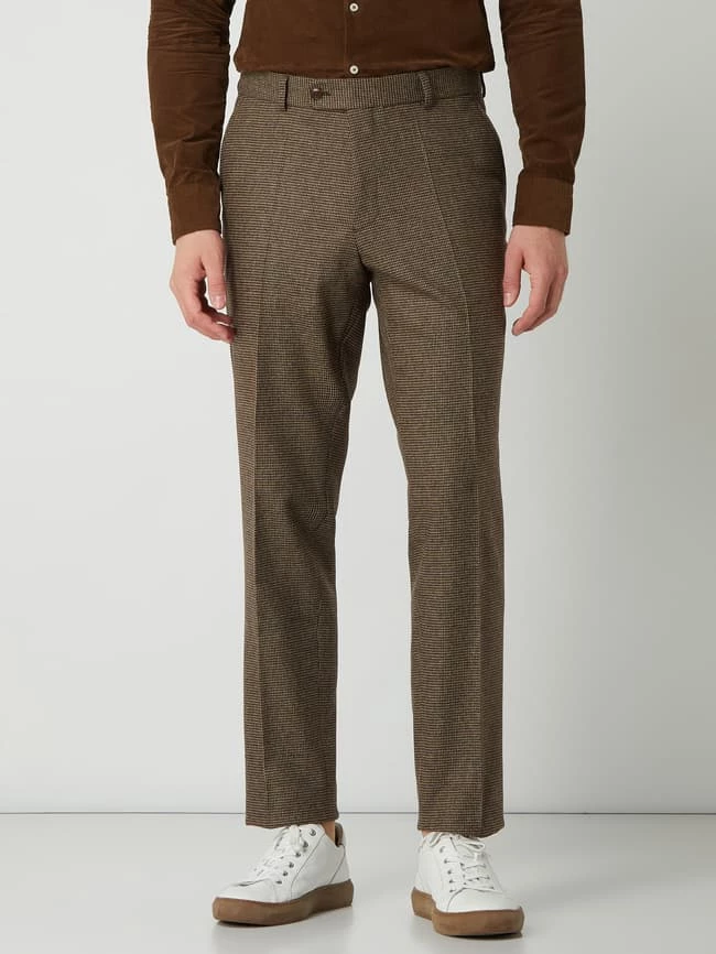 Die Anzughose von Carl Gross ist aus einer Wollmischung mit Stretch-Anteil gefertigt und im Modern Fit gehalten. Sie kommt mit Hahnentritt-Dessin, geknöpften Leistentaschen und Bügelfalten.
