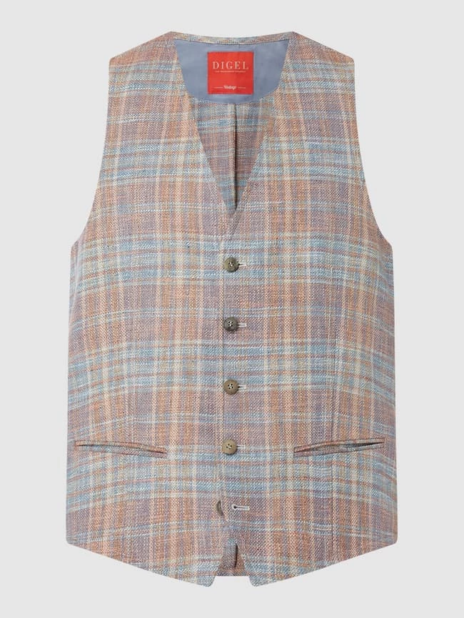 Die Weste von DIGEL ist aus einer Baumwollmischung mit Leinen- und Schurwoll-Anteil gefertigt. Sie kommt im Slim Fit mit Webmuster, Paspeltaschen und verstellbaren Knopfriegeln.