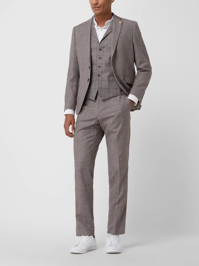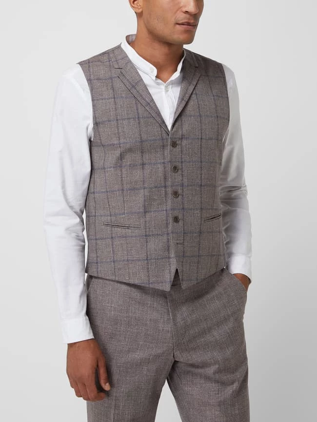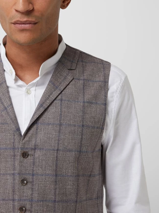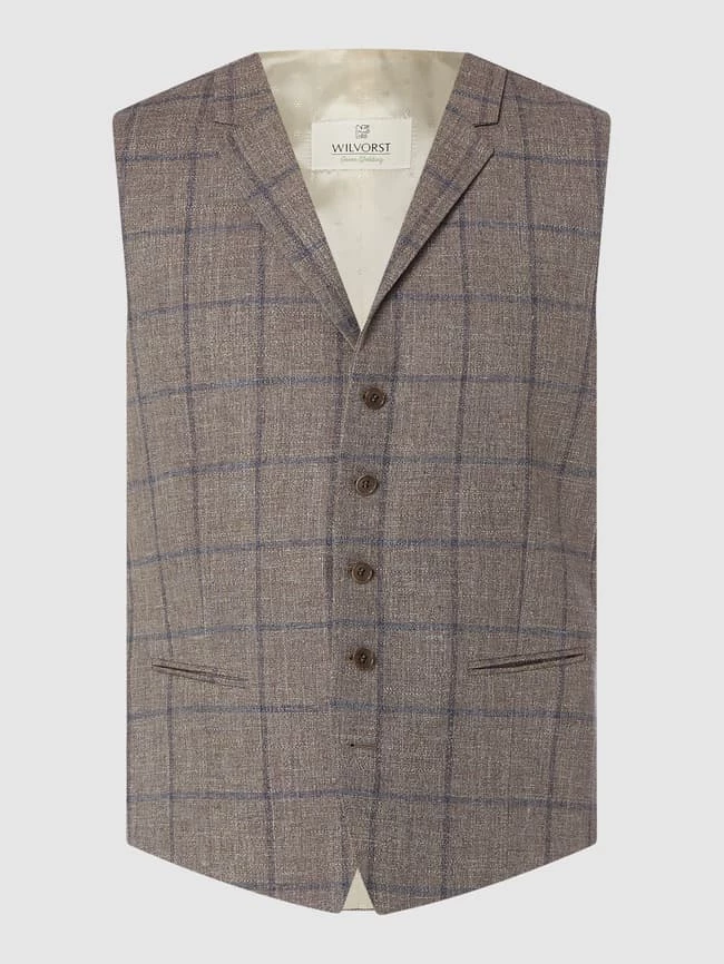 Die Weste von WILVORST ist aus einer Wollmischung mit Baumwoll- und Leinen-Anteil gefertigt. Sie kommt in gerader Passform mit Reverskragen, Paspeltaschen und verstellbarem Riegel.